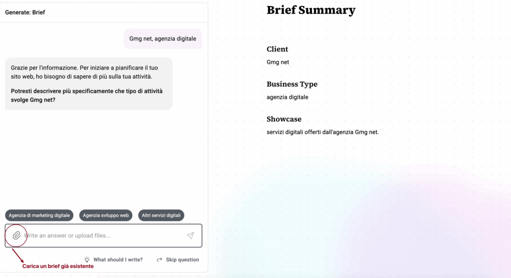 AI Site Planner guida l’utente attraverso una chat interattiva in cui basta descrivere l’attività o l’obiettivo del sito.